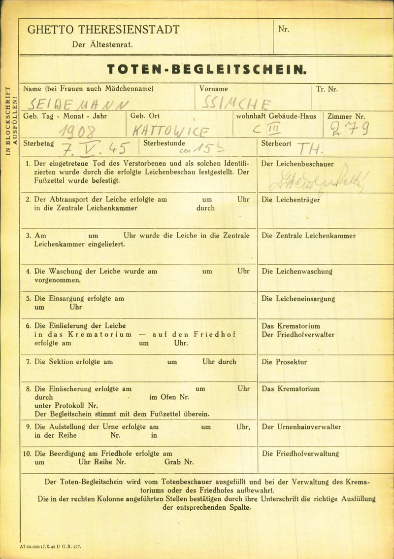 Seidemann Symcha: Death certificate, Ghetto Terezín