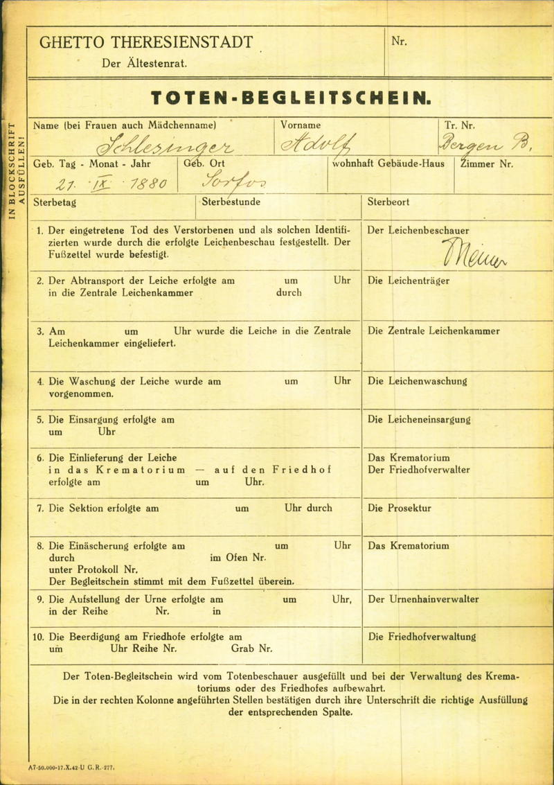 Schlesinger Adolf: Death certificate, Ghetto Terezín