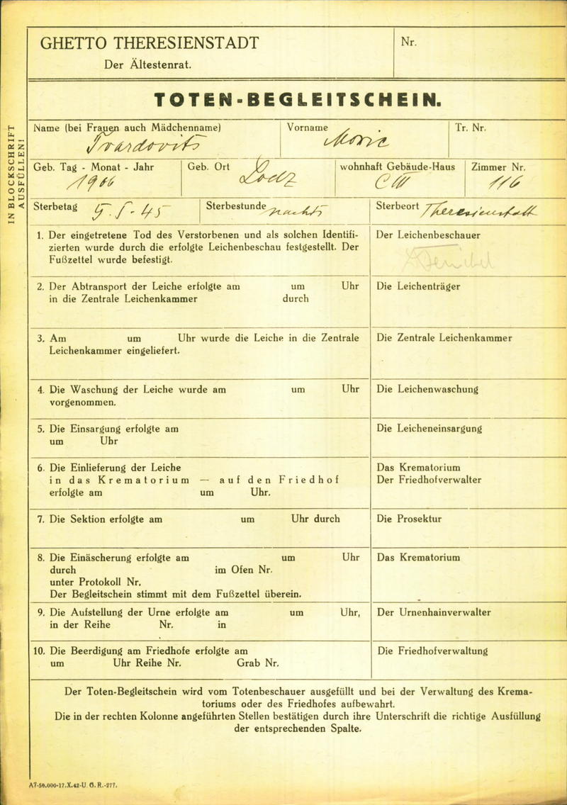 Tvardovics Moric: Death certificate, Ghetto Terezín