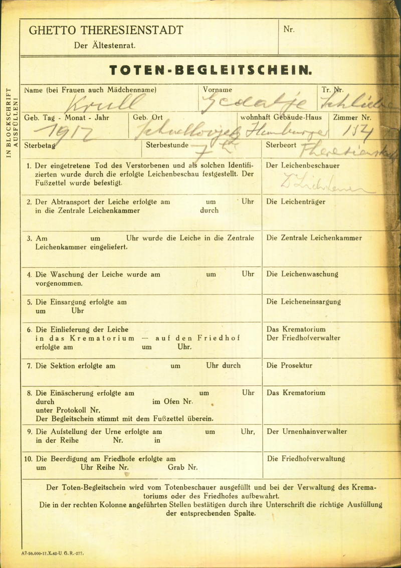 Krul Gedalie: Death certificate, Ghetto Terezín