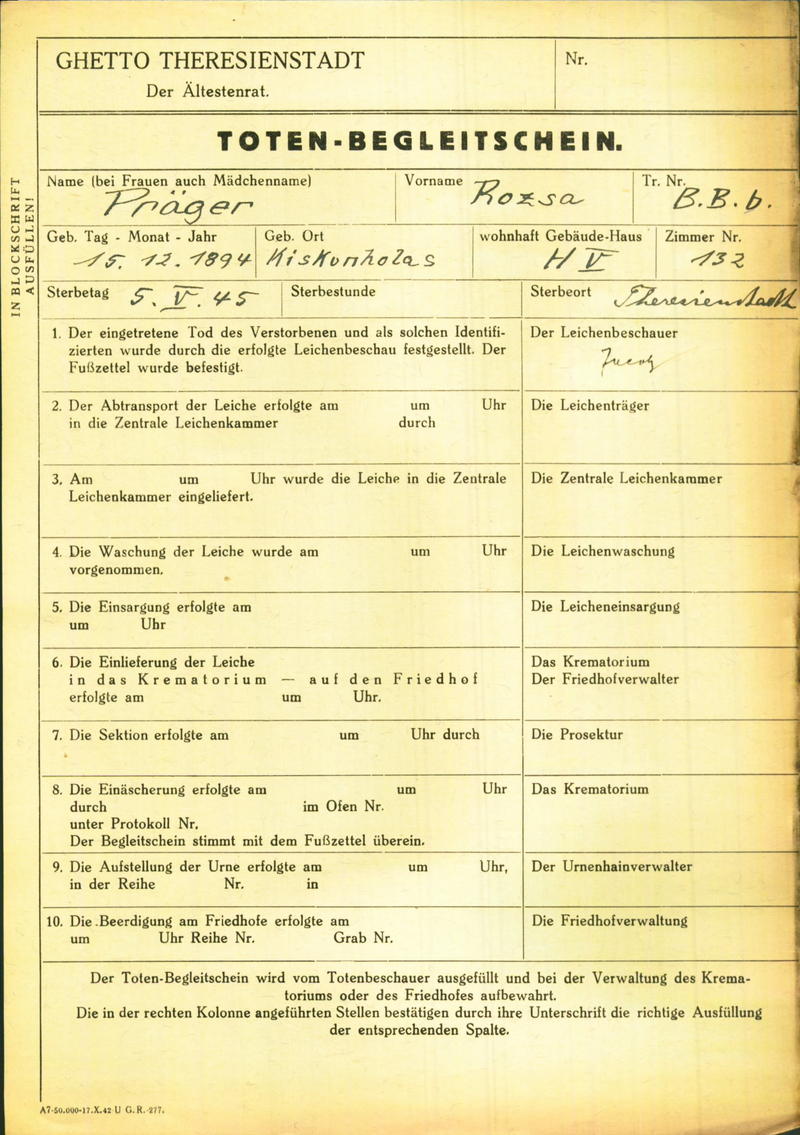 Prager Rózsa: Death certificate, Ghetto Terezín