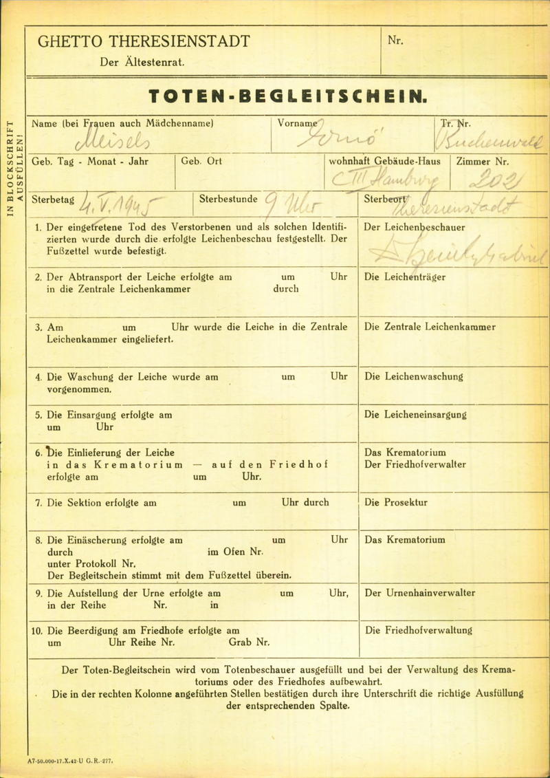 Meisels Ernö: Death certificate, Ghetto Terezín
