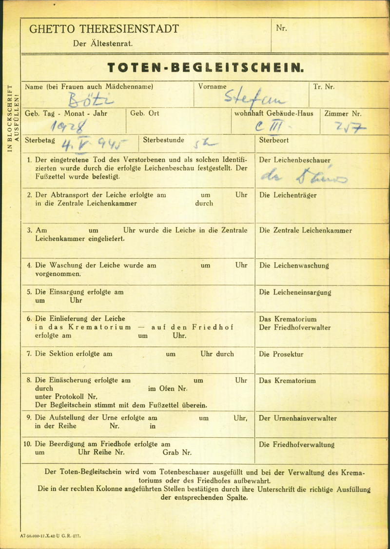 Böthy István: Death certificate, Ghetto Terezín