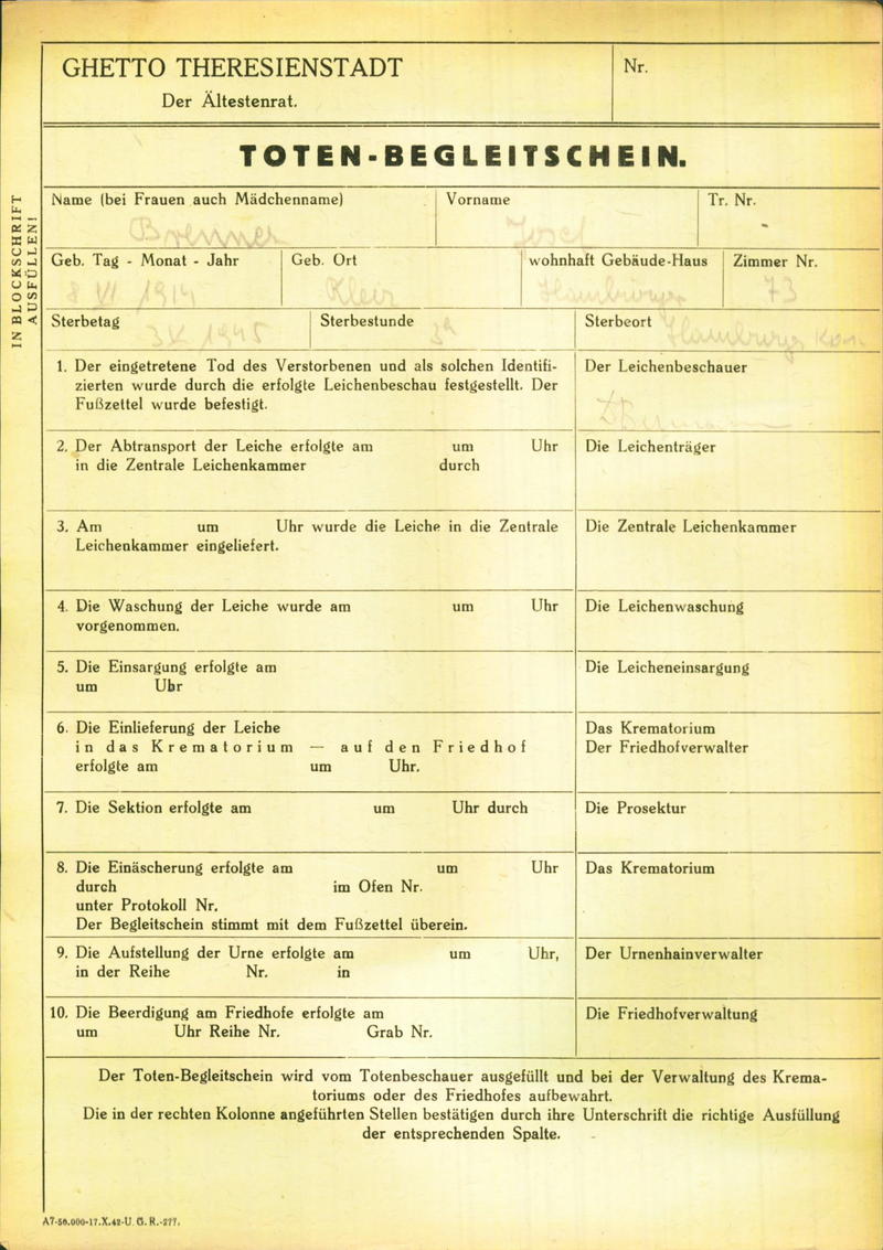 Brenner Josef: Death certificate, Ghetto Terezín