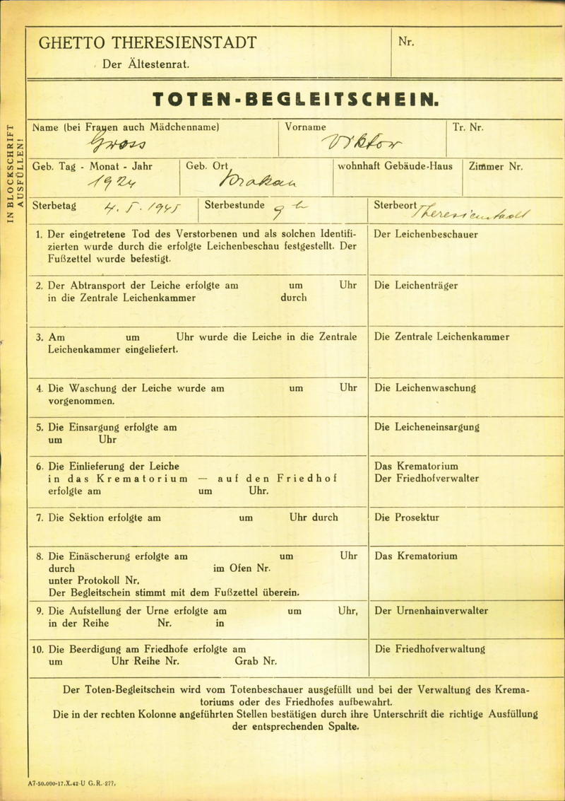 Gross Wiktor: Death certificate, Ghetto Terezín