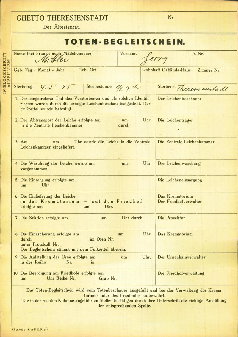 Mitler Jerzy: Death certificate, Ghetto Terezín