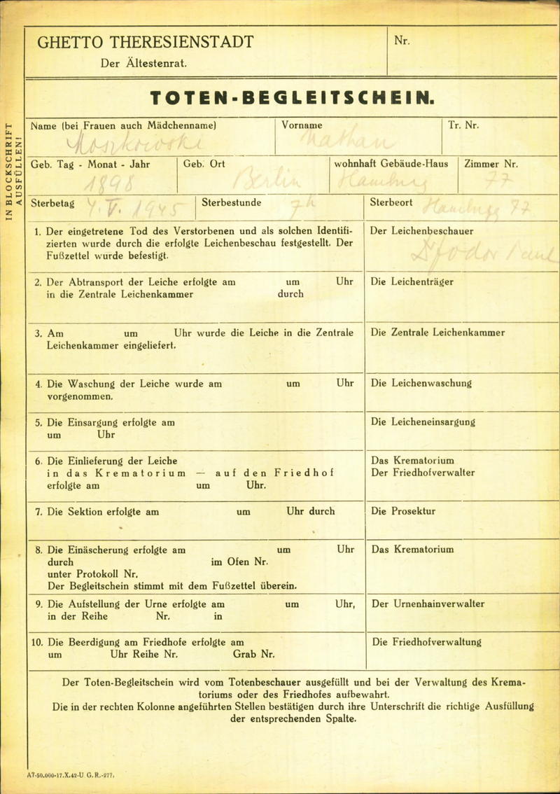 Moszkowski Nathan: Death certificate, Ghetto Terezín