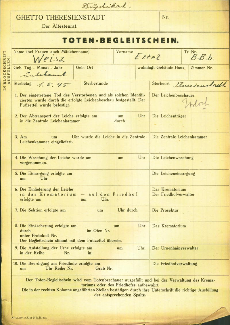 Weisz Ettel: Death certificate, Ghetto Terezín