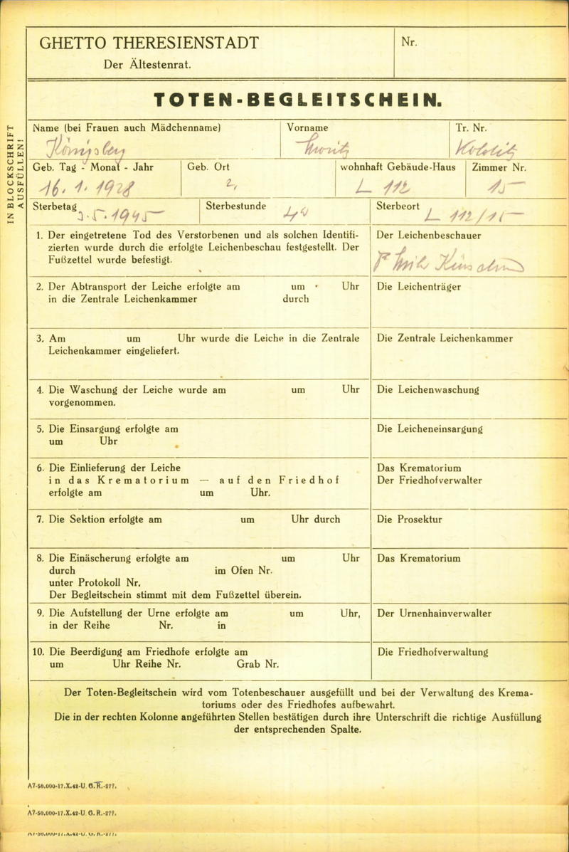 Königsberg Moritz: Death certificate, Ghetto Terezín