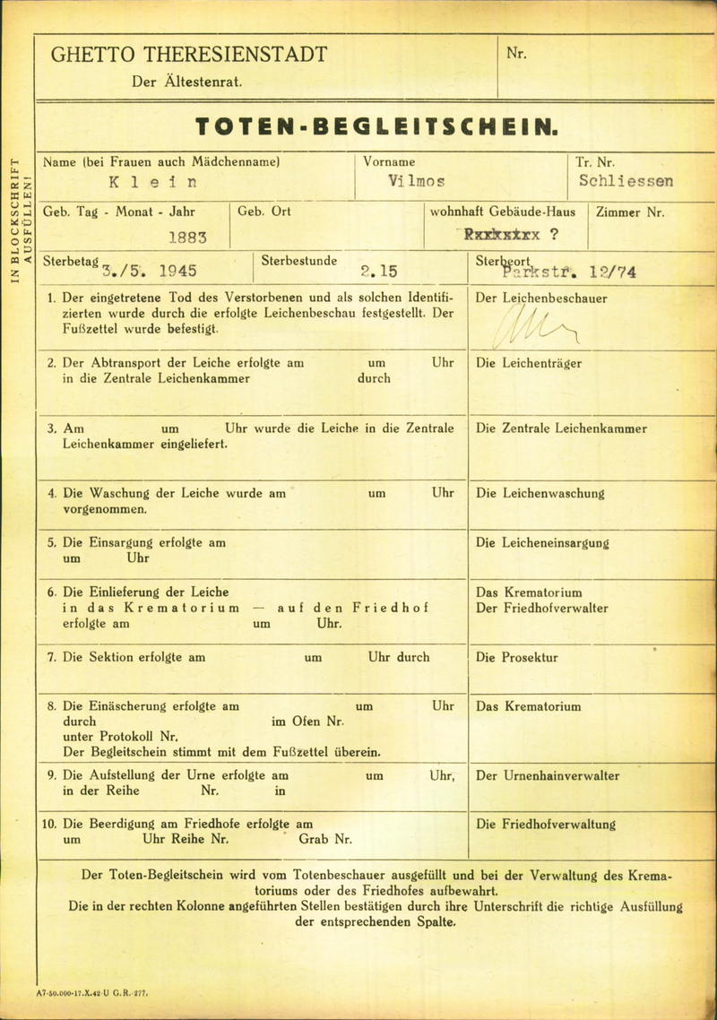 Klein Vilmos: Death certificate, Ghetto Terezín