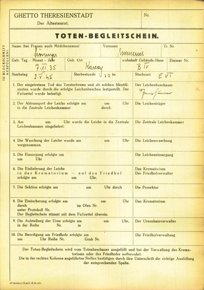 Löwinger Emmerich: Death certificate, Ghetto Terezín