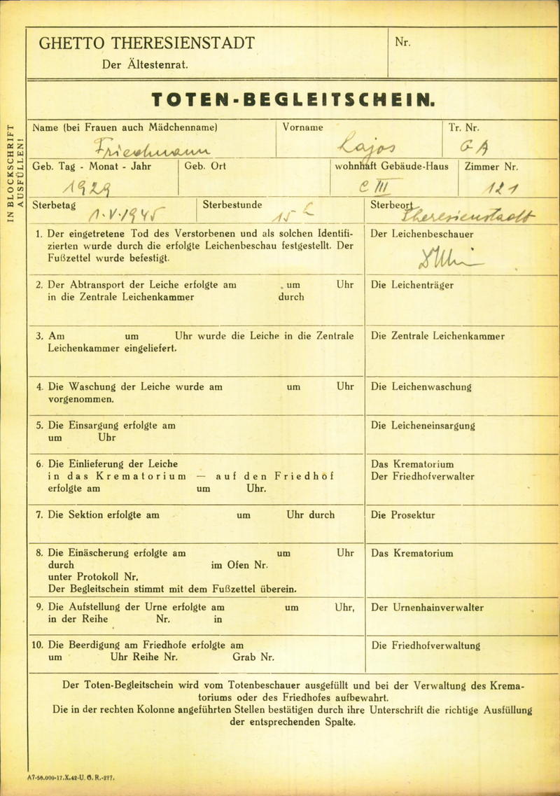 Friedmann Lajos: Death certificate, Ghetto Terezín