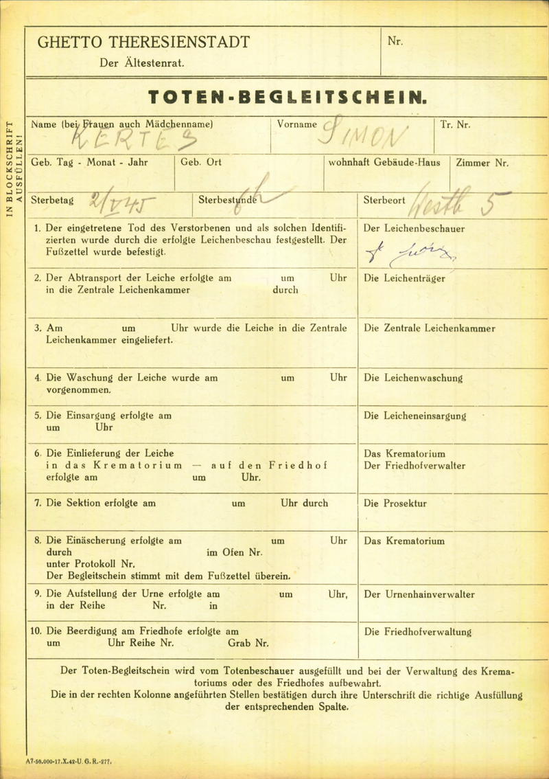 Kertész Simon: Death certificate, Ghetto Terezín