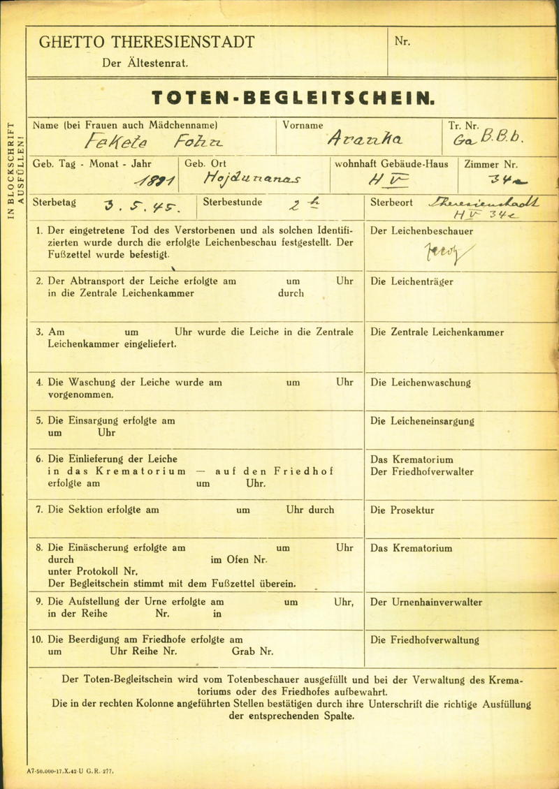 Fekete Aranka: Death certificate, Ghetto Terezín