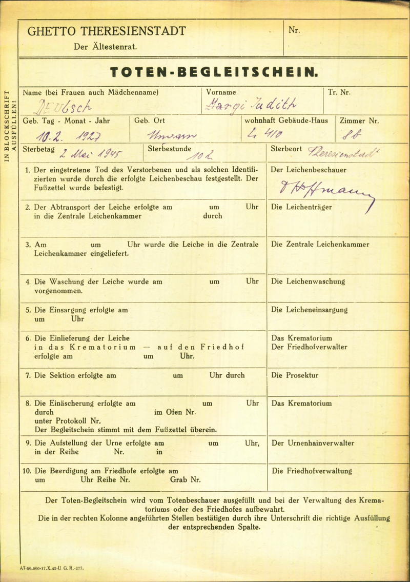 Deutsch Judith: Death certificate, Ghetto Terezín