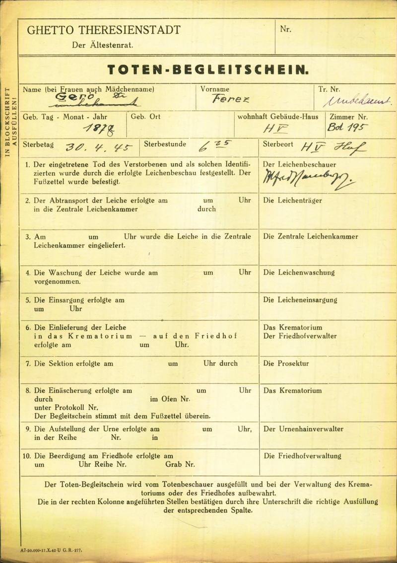 Gerö Teréz: Death certificate, Ghetto Terezín