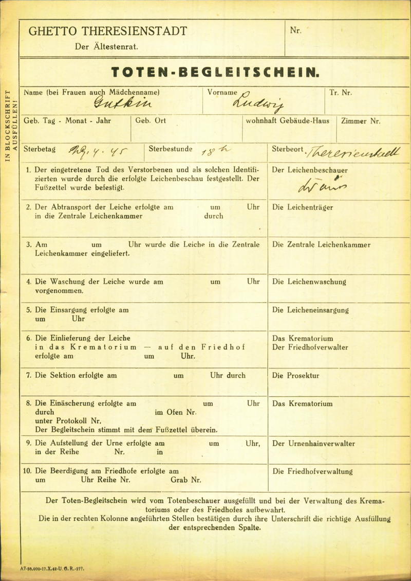 Gutkin Ludwig: Death certificate, Ghetto Terezín
