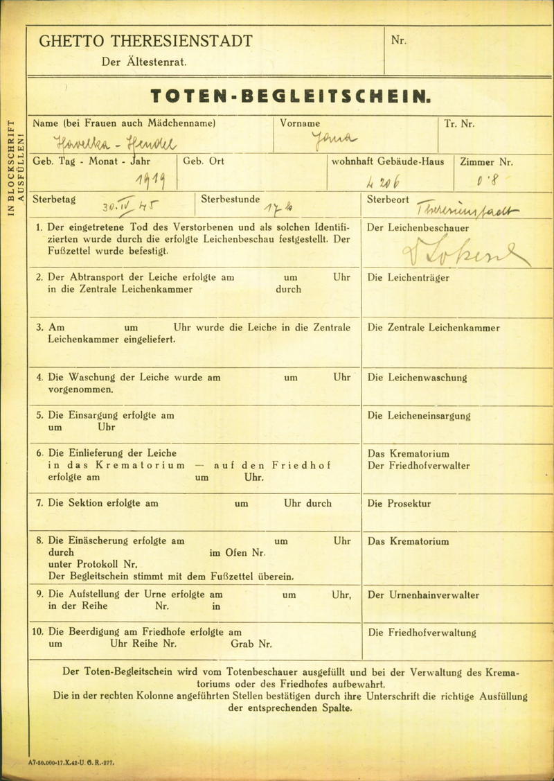Havelka-Hendel Jana: Death certificate, Ghetto Terezín