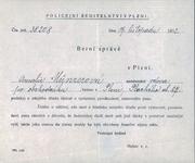 Born 12. 03. 1881 Last residence before deportation: Pilsen Address/place of registration in the Protectorate: Pilsen Transport T, no. 37 (26. 01. 1942, Pilsen -> Terezín) Transport Eq, no. 1397 (12. 10. 1944, Terezín -> Auschwitz) Murdered